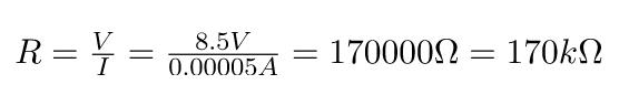 有0.05mA电流流过电阻器,因此也通过输入引脚下降到地。再次,使用欧姆定律找出电压降为8.5V和电流为0.05mA的物体的电阻: