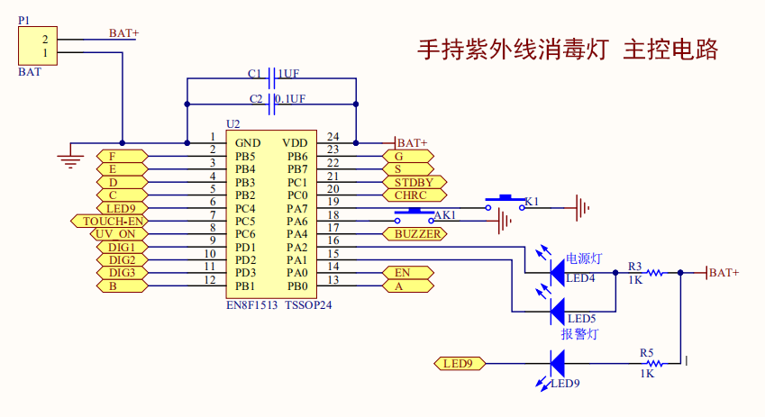 由英锐恩推出的手持紫外线消毒灯方案,其主控芯片为EN8F1513,上电默认进入关机状态,短按按键(小于0.5s)进行开关机,开机时电源灯常亮,关机时电源灯熄灭,关闭数码管和所有灯。开机状态,当电池电压低于3.30V时,进行低压报警(报警灯闪烁,0.5s亮,0.5s灭)。当电池电压低于3V时,关机。