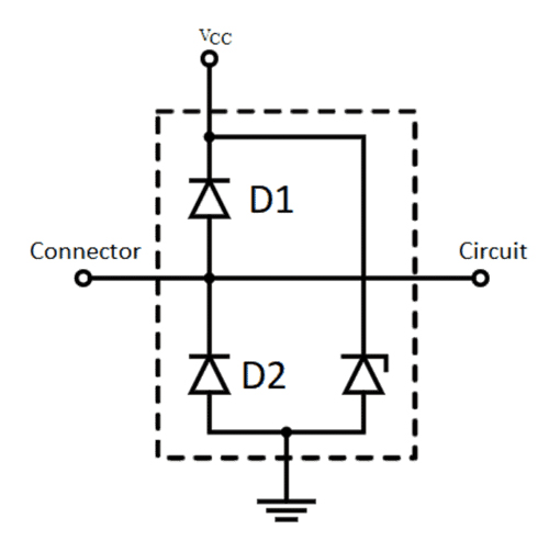 类似地,当连接器上的电压上升到Vcc以上时,D1被打开以将过多的电流从电路中转移出去。当电流转移到Vcc时,存在电流可能流动并损坏其他组件的风险,这解释了放置额外齐纳二极管的原因。齐纳二极管将为过量电流从Vcc流向地提供安全路径。
