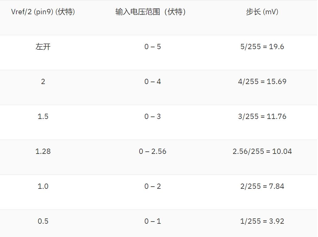 ADC0804的Vref/2(引脚9)处的电压可以在外部进行调节,以将较小的输入电压跨度转换为全8位分辨率。Vref/2(pin9)左开表示输入电压跨度为0-5V,步长为5/255=19.6V。查看下表,了解不同的Vref/2电压和相应的模拟输入电压范围: