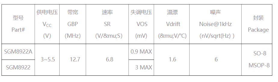 SGM8922输入电压为3V~5.5V;增益带宽为12.7MHz;速率为6.8V/μs;通道隔离度为-120dB;THD+N为0.003%。